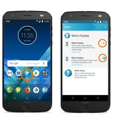 - ACCESS AND CHANGE ALWAYS ON DISPLAY SETTINGS: From the home screen, select the Moto app > Moto Display > edit Always on display settings as desired.