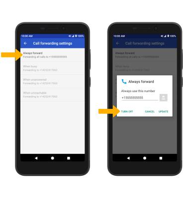 Note: To change the Call forwarding number while Call forwarding is already active, from the Always forward screen edit the number then select UPDATE.
