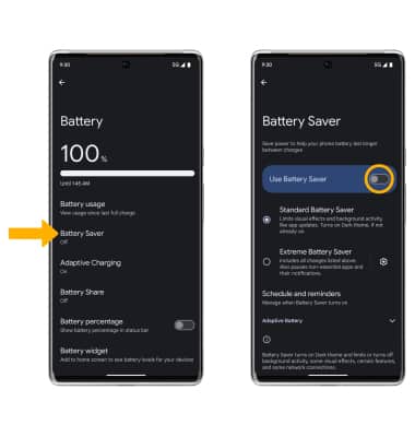From the Battery screen, select Battery Saver then select the Use Battery Saver switch.