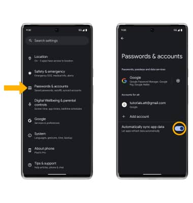 From the Settings screen, scroll to and select Passwords & accounts then select the Automatically sync app data switch.