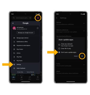 Play Store app > Account icon > Settings > Network preferences > Auto-update apps > Don't auto-update apps > OK.