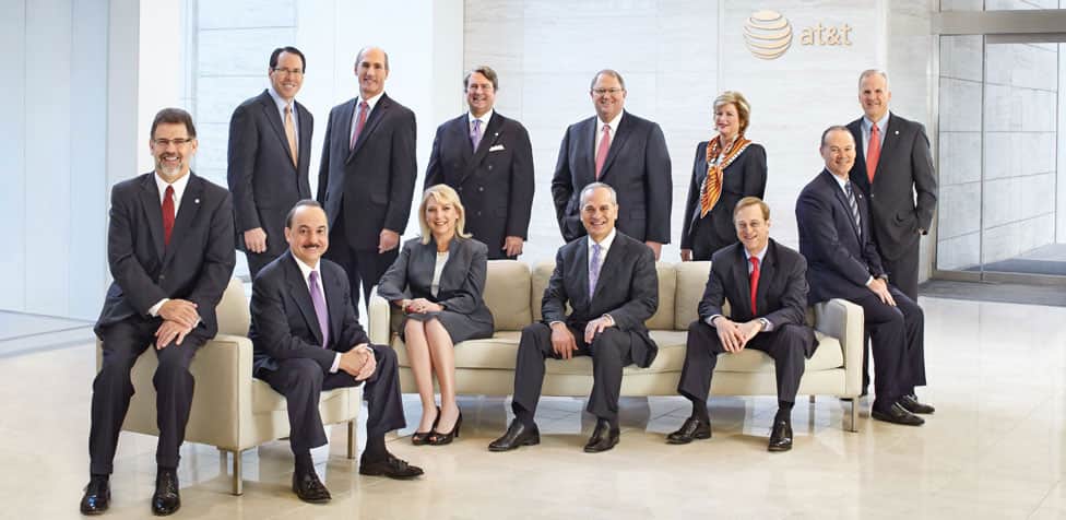 Left to Right: Standing Randall Stephenson, Chairman, Chief Executive Officer and President; John Stankey, Group President and Chief Strategy Officer; Ron Spears, Senior Executive Vice President-Executive Operations; Wayne Watts, Senior Executive Vice President and General Counsel; Cathy Coughlin, Senior Executive Vice President and Global Marketing Officer; Bill Blase Jr., Senior Executive Vice President-Human Resources. Seated John Stephens, Senior Executive Vice President and Chief Financial Officer; Ralph de la Vega, President and Chief Executive Officer, AT&T Mobility; Lori Lee, Executive Vice President-Home Solutions; Andy Geisse, Chief Executive Officer-AT&T Business Solutions; Jim Cicconi, Senior Executive Vice President-External and Legislative Affairs, AT&T Services, Inc.; John Donovan, Senior Executive Vice President-AT&T Technology and Network Operations.