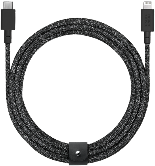 Native Union Belt Cable XL USB-C to Lightning Cable features an extra-long braided 10-foot cable with genuine leather strap. It supports Power Delivery for high-speed charging. Wrap and secure it to keep it tangle-free. Plus, get enhanced durability with reinforced construction.