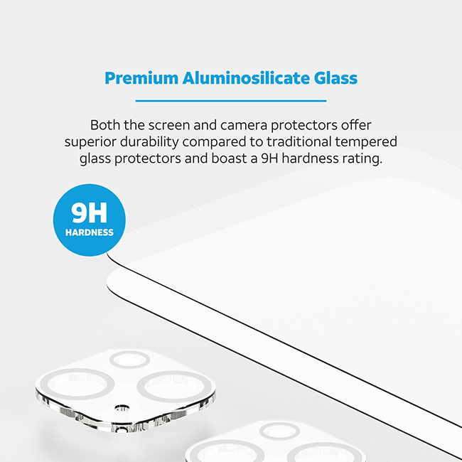 Discover unparalleled protection with our cutting-edge screen protectors, crafted from premium aluminosilicate glass—engineered to be tough and ready to take on the challenges of daily life, absorbing shocks and resisting impacts with ease. These protectors are a gamechanger, offering a significant boost in scratch resistance and 25% more protection than your average protector. We've infused each screen protector surface with an advanced anti-fingerprint coating to keep your screen looking immaculate and crystal clear. Plus, no need to worry about our camera protectors interfering with new technology. Our lens protectors integrate perfectly with the augmented reality, nighttime photography, and all other functions of the camera. We also made sure installation is a breeze. We've included an installation tool that makes aligning the protector with your screen effortless. No more bubbles, no more fuss. Plus, with a two-pack of protectors, you can swap them out anytime you want and always keep that fresh screen feeling.