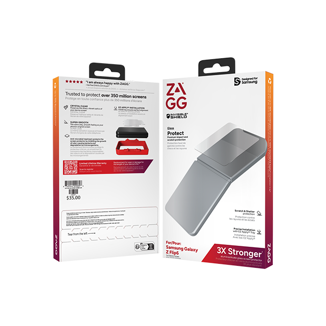 Love the cover screen on your Galaxy Flip6 phone? Protect it with the #1 name in screen protection. ZAGG Glass is made with incredibly hard, scratch- and shatter-resistant, tempered glass. It’s 3x stronger than basic glass screen protection, and its antimicrobial treatment protects the screen protector by inhibiting the growth of odor-causing bacteria. With ZAGG Glass screen protection, you don’t have to worry about the contents of your pocket or bag scratching the exterior screen on your phone, and you can feel confident taking it on every adventure.