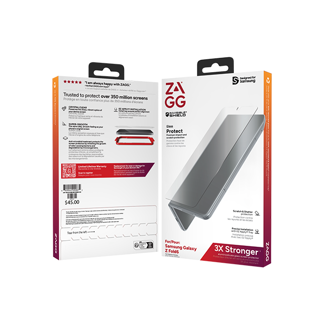 Love the cover screen on your Galaxy Fold6 phone? Protect it with the #1 name in screen protection. ZAGG Glass is made with incredibly hard, scratch- and shatter-resistant, tempered glass. It’s 3x stronger than basic glass screen protection, and its antimicrobial treatment protects the screen protector by inhibiting the growth of odor-causing bacteria. With ZAGG Glass screen protection, you don’t have to worry about the contents of your pocket or bag scratching the exterior screen on your phone, and you can feel confident taking it on every adventure.