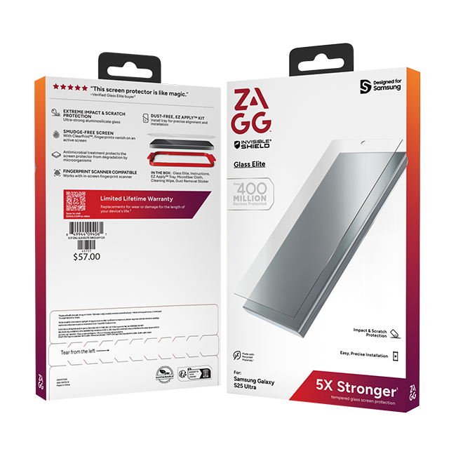 Ultra-strong aluminosilicate glass has been tested up to 5x stronger than traditional glass screen protection. Glass Elite has a ClearPrint™ surface treatment that makes fingerprints invisible when your screen is turned on and is made with 30% post-consumer recycled glass. Plus, the application is simple with the EZ Apply® installation tray for precise alignment and a dust-free adhesive.