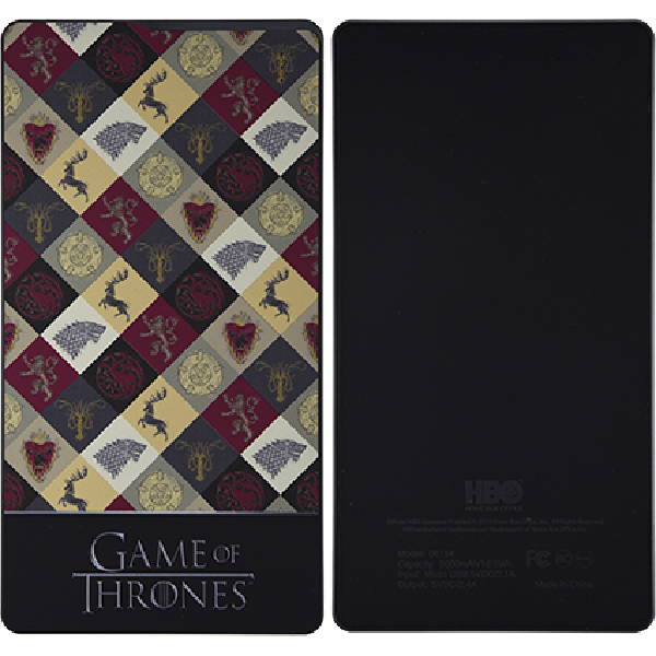 Featuring all 4 family crests from HBO’s hit series Game of Thrones™, this portable power solution delivers a level of power that any Game of Thrones™ fan would be proud to wield. It’s 5000mAh capacity will fully charge your device up to 2 times, and it’s high speed 5V/2.4a USB-A output charges your device 2.5x faster than most traditional batteries. Couple that with a 5V/2.1 Micro-USB input, and now you’re truly minimizing your time at the outlet. Rounding out the feature set, you’ve got a 4 LED power level indicator so you can rest assured that you’ll always know how much power you have. Tested and certified by AT&T, it comes with a one-year limited warranty. Now that’s power and security.