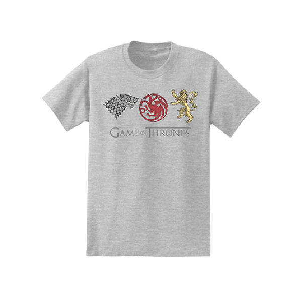 Enjoy this comfortable officially licensed Game of Thrones™ Sigils t-shirts. You can sport this amazing t-shirt with the sigils of the 3 major houses during the final season of your favorite show, Game of Thrones™. This shirt is perfect for any fans of the show, and it would also make an excellent gift for any real fan! Officially Licensed Game of Thrones™ Apparel.