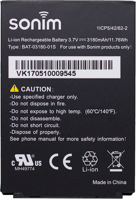 Sonim high capacity, 3180mAh lithium ion battery for XP5 and XP5s handsets. This replaceable battery provides 25 hours of talk time or 25 days of standby time.