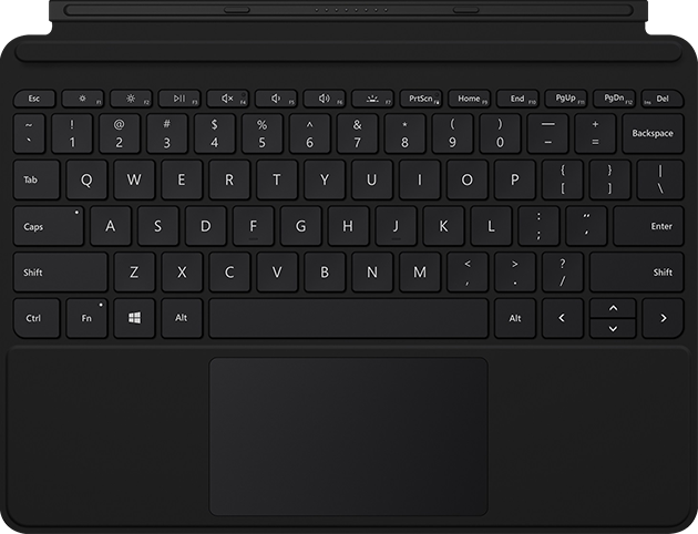 For a full keyboard and fluid typing, pair Surface Go Type Cover with Surface Go 2. Sleek, compact, and adjustable, it includes a complete keyset (QWERTY + function keys), backlighting, and large trackpad for precise navigation.
