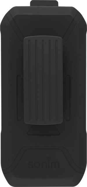 Sonim industrial holster, custom designed to support the entire handset while front or back-facing into the holster. The rugged holster securely holds the XP5s handset, which may be easily released via the quick-release latch. The innovative belt-clip rotates 360 and includes a built-in stand to hold the phone while on a desk or table.