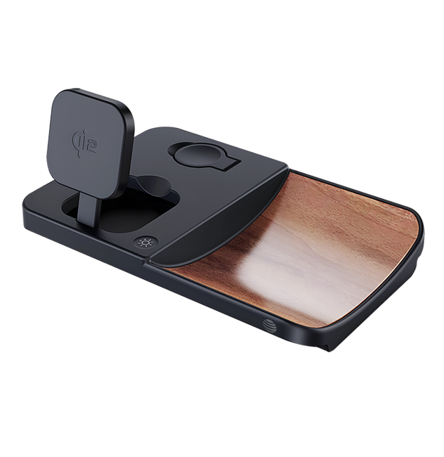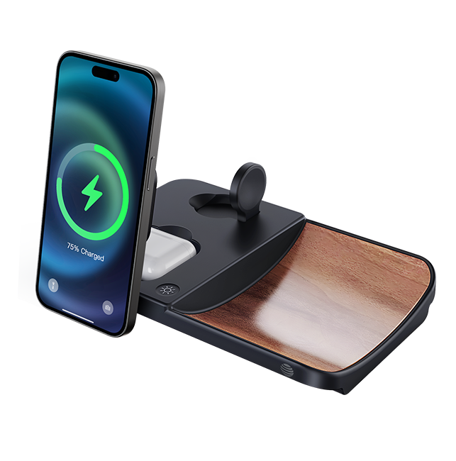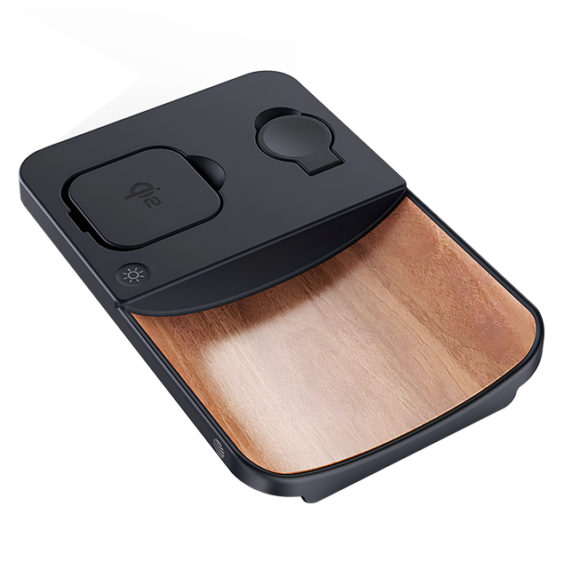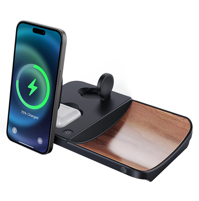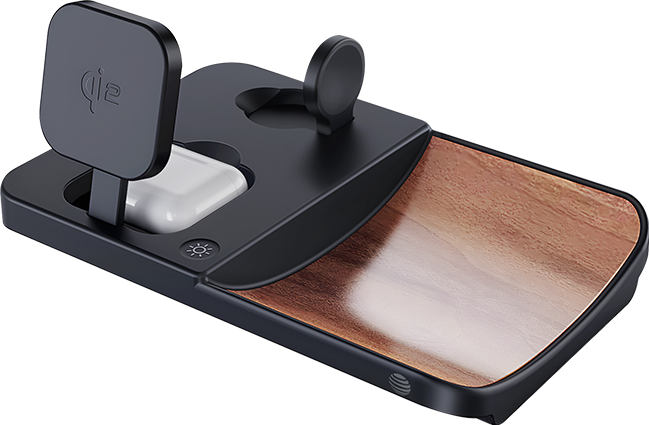 The AT&T 3-in-1 Wood Grain Power Tray is a sleek and versatile charging solution that elevates your daily routine with its blend of style and functionality. Designed to wirelessly charge up to three devices simultaneously, this power tray is the perfect accessory for your bedside table, office desk, or any space where you need to keep your essential gadgets powered up. Whether it's your smartphone, smartwatch, or wireless earbuds, this Power Tray handles them all with ease thanks to its multi-device charging capability. With a fast wireless charging feature, this power tray delivers up to 15W for smartphones, 5W for smartwatches, and 2.5W for earbuds, ensuring your devices are powered up quickly and efficiently. The tray's Qi2 certification means it meets the highest standards in wireless charging technology, providing a safe and reliable charging experience for all compatible devices.