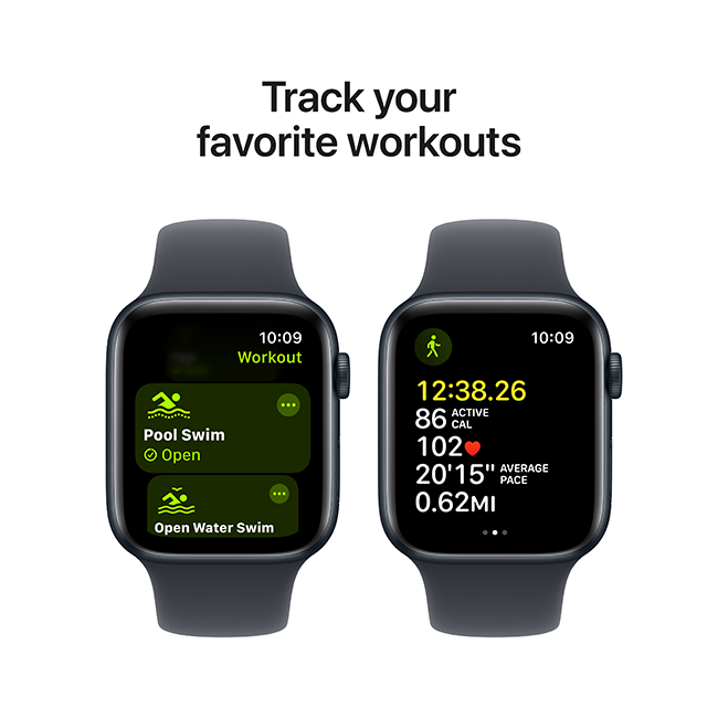 9All-day battery life is based on the following use: 90 time checks, 90 notifications, 45 minutes of app use, and a 60-minute workout with music playback from Apple Watch via Bluetooth, over the course of 18 hours; Apple Watch SE (2nd generation) (GPS) usage includes connection to iPhone via Bluetooth during the entire 18-hour test; Apple Watch SE (2nd generation) (GPS + Cellular) usage includes a total of 4 hours of LTE connection and 14 hours of connection to iPhone via Bluetooth over the course of 18 hours. Testing conducted by Apple in August 2022 using preproduction Apple Watch SE (2nd generation) (GPS) and Apple Watch SE (2nd generation) (GPS + Cellular), each paired with an iPhone; all devices tested with prerelease software. Battery life varies by use, configuration, cellular network, signal strength, and many other factors; actual results will vary.