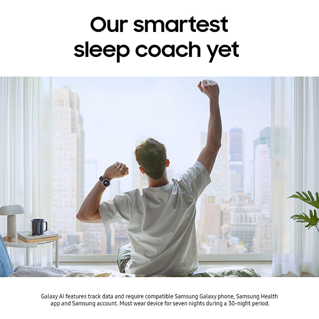 1Galaxy AI features track data and require compatible Samsung Galaxy phone, Samsung Health app and Samsung account. Must wear device for seven nights during a 30-night period.