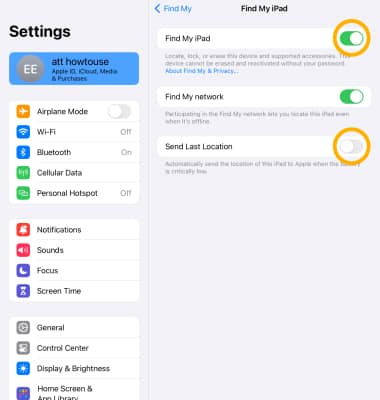 Send Last Location switches are in the On position. When you set up Find My iPad, Activation Lock is turned on automatically.
