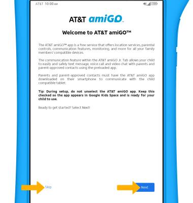 18. Review the Welcome to AT&T amiGO prompt. Select Next and follow the prompts to continue setting up AT&T amiGO, or select Skip to set it up later.