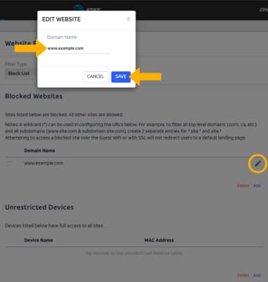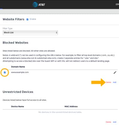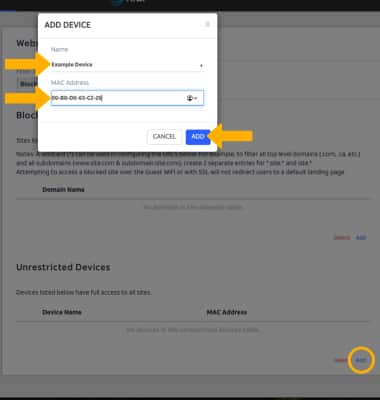 Select Add under Blocked Websites. Enter the desired Domain Name, then select ADD.