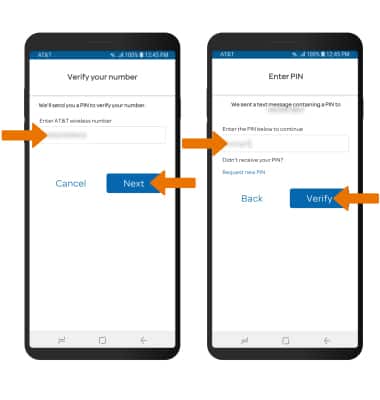- Enter your myAT&T wireless number, then select Next. Enter the PIN sent via text, then select Verify.