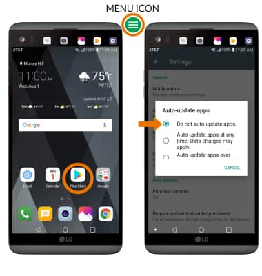 - TURN OFF AUTO-UPDATE FOR APPS: From the home screen, select the Play Store app > Menu icon > Settings > Auto-update apps > Do not auto-update apps.