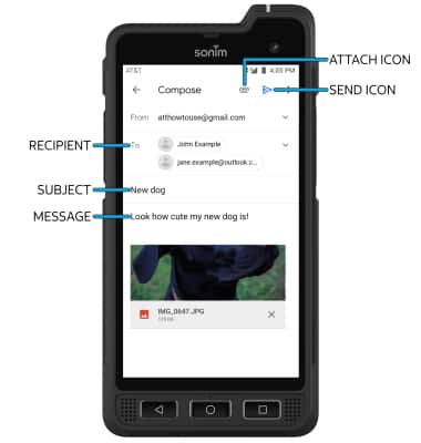 2. Enter the recipient(s) email address, then enter the desired subject and message. Select the Attach icon and follow the prompts to add an attachment. When finished, select the Send icon.
