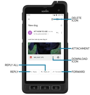 EMAIL OPTIONS: Select Reply, Reply all, or Forward to respond to an email. Select an attachment to view. Select the Download icon to save the attachment. Select the Delete icon to delete an email.