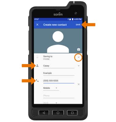 2. Enter the desired contact information in the corresponding fields. Select the dropdown icon to select the desired account you want to save the contact to. To add a picture, select the