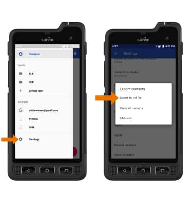 Menu icon > Settings > Export > Export to .vcf file > follow the prompts.