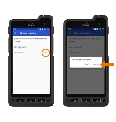 UNBLOCK: From the Blocked numbers screen, select the X icon next to the desired number then select UNBLOCK.