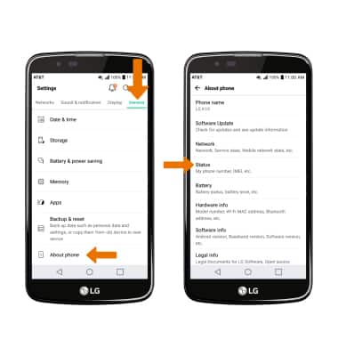 - From the General tab, scroll to and select About phone > select Status.