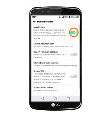 Note: Mobile data is on by default. Turning off the mobile data will not allow any data to be transferred over the wireless network. Wi-Fi access, voice function, and standard text messaging are still allowed. You can also turn data on/off using your myAT&T account.
