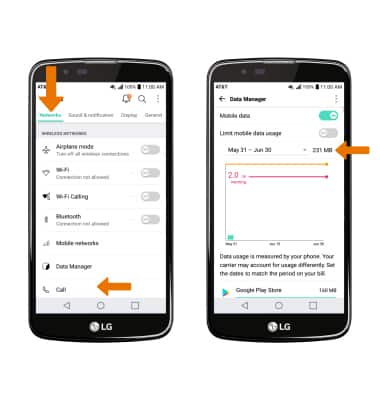 - From the Networks tab in the Settings menu, select Data Manager. Data usage for the current cycle will be displayed.