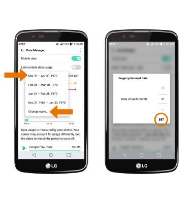 - CHANGE THE BILLING CYCLE: Select the Data usage cycle drop-down. To change the billing cycle start date, select Change cycle > Select the Desired date > select SET.
