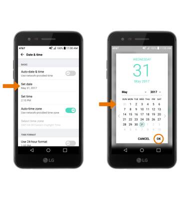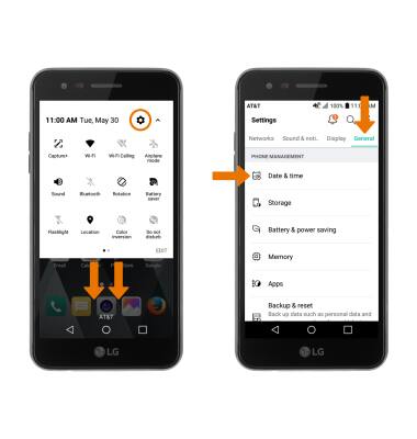 - ADJUST DATE & TIME: Swipe down from the Notification bar with two fingers, then select the Settings icon. From the General tab, scroll to and select Date & time.
