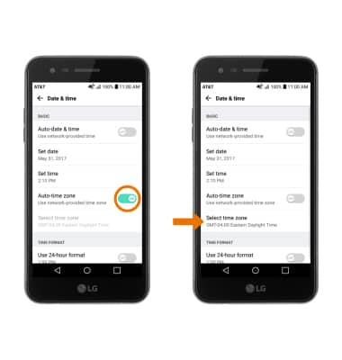 - CHANGE TIME ZONE: Select the Auto-time zone switch. Select Select time zone, then select desired time zone.