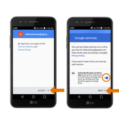 - Select ACCEPT. Review the Google services prompt, then select the Automatically back up device data switch if desired. Select NEXT to finish set up.