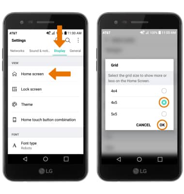 - CHANGE GRID SIZE OF HOME SCREEN ICONS: From the Settings screen, select the Display tab > Home screen > Grid > desired size preference > OK.