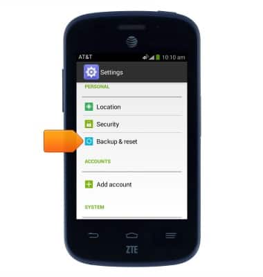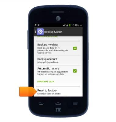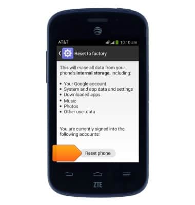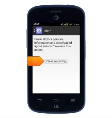 Note: A factory reset reverts the device back to factory settings. It will permanently erase all personal data, preferences, settings and content such as pictures, ringtones and apps that are saved to the device. Data stored to an SD card will not be erased unless otherwise selected. It is recommended that you save (backup) important data to your SIM, SD card, or a computer before proceeding.