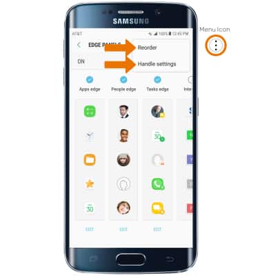 - EDIT EDGE TAB APPEARANCE: To reorder the edge panels or change how the Edge tab appears, select the Menu icon. Select Handle settings. In handle settings you can change the position, size, and transparency of the Edge tab. To reorder your current edge panels, select Reorder then reorder the panels to their desired locations.