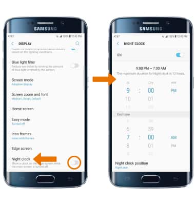 - ENABLE OR DISABLE NIGHT CLOCK: From the Display settings screen, select the Night clock switch. To edit Night clock settings, select Night clock. Edit settings as desired.
