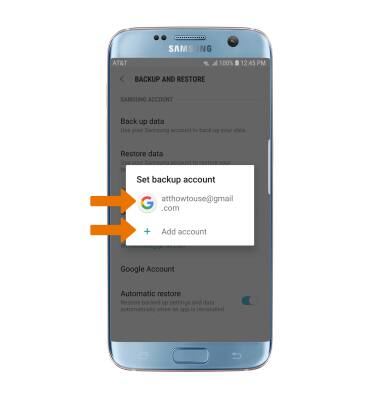 - ADD A NEW BACKUP ACCOUNT: Select the desired backup account option or select Add account. When you add your Google account to a device, the data that you previously backed up for that Google account is restored to the device.
