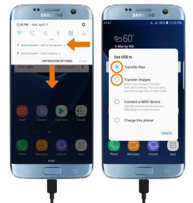 - To place the device into the correct USB mode, swipe down from the Notification bar, then select the Android System drop down menu > Charging notification > Transfer files or Transfer images.