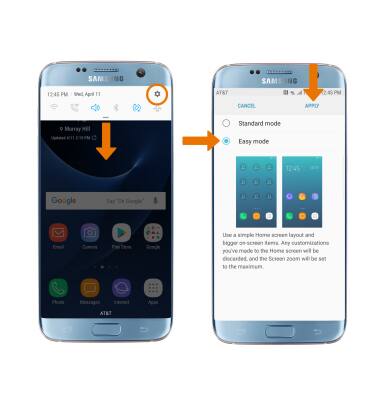 - EASY MODE: Swipe down from the Notification bar, then select the Settings icon > Display > Easy mode > Easy mode > APPLY.