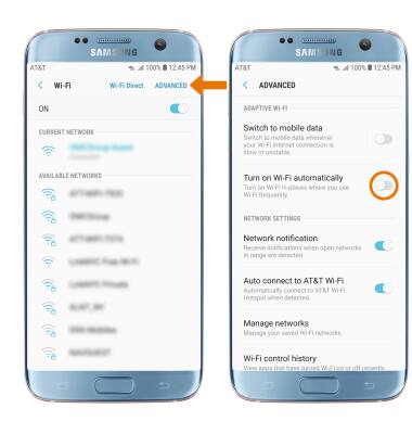 - TURN ON WI-FI AUTOMATICALLY: From the Wi-Fi screen, select ADVANCED then select the Turn on Wi-Fi automatically switch.