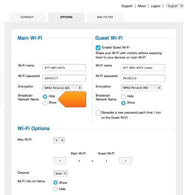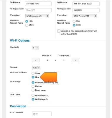 - To prevent the hotspot from broadcasting the network name, scroll to Main Wi-Fi and click the Hide checkmark under Broadcast Network Name.