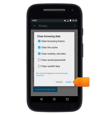 - Select 'Clear browsing history' along with any other desired options, then tap CLEAR.