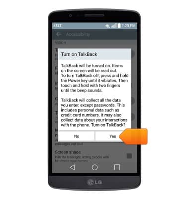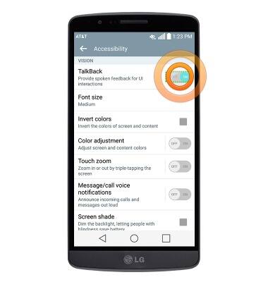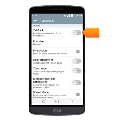 - Adjust the desired accessibility settings as desired. To enable Talkback, tap the TalkBack switch to on.