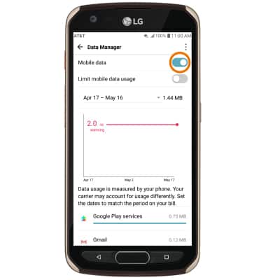 Note: Mobile data is on by default. Turning off the mobile data will not allow any data to be transferred over the wireless network. Wi-Fi access, voice function, and standard text messaging are still allowed. You can also turn data on/off using your myAT&T account. Learn more about disabling or activating AT&T Mobile Share member’s data usage by device.