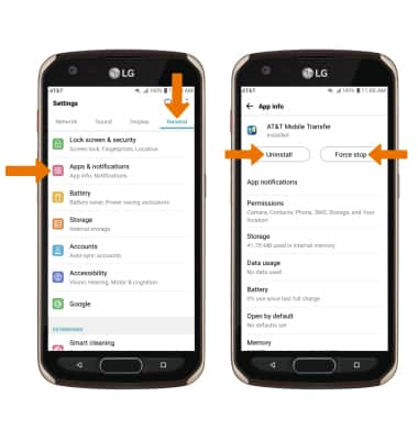 From the Settings screen, select the General tab > Apps & notifications > App info > desired app. From here, you may Uninstall or Force stop the app.