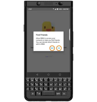 - Select OK to find friends in your contacts list to add to BBM. Select SKIP to continue without adding contacts.